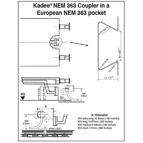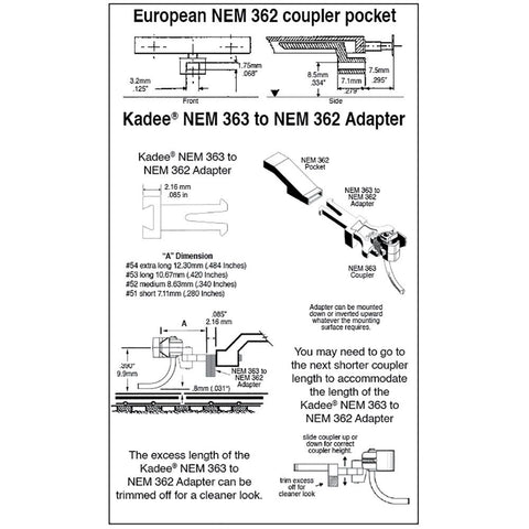 This industry-leading coupler features an NEM 363 European Style Coupler. The #52 Magne-Matic® NEM 363 European Style Coupler has three mounting options. It can be mounted in a factory NEM-363 pocket, it can be mounted using the (included) Kadee® NEM 363 to NEM 362 Adapter in a NEM 362 pocket, or can be mounted using the (included) Kadee® Bolt-on NEM 363 Adapter to a flat service on the underside of the loco or car. The height of the coupler can be easily adjusted to match the Kadee coupler height gauge by sliding the couple up or down in the dovetail slot. The excess mounting adapter can be trimmed away for a cleaner look.