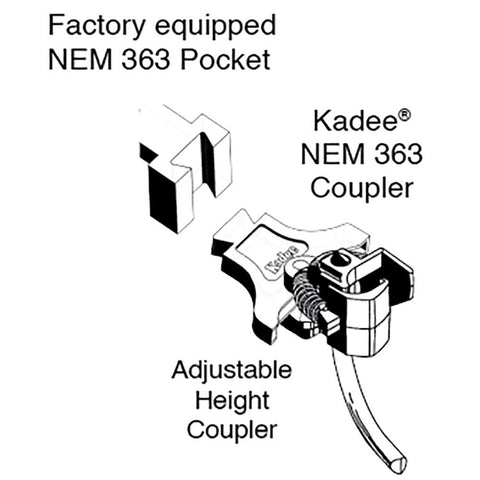 This industry-leading coupler features an NEM 363 European Style Coupler. The #53 Magne-Matic® NEM 363 European Style Coupler has three mounting options. It can be mounted in a factory NEM-363 pocket, it can be mounted using the (included) Kadee® NEM 363 to NEM 362 Adapter in a NEM 362 pocket, or can be mounted using the (included) Kadee® Bolt-on NEM 363 Adapter to a flat service on the underside of the loco or car. The height of the coupler can be easily adjusted to match the Kadee coupler height gauge by sliding the couple up or down in the dovetail slot. The excess mounting adapter can be trimmed away for a cleaner look.
