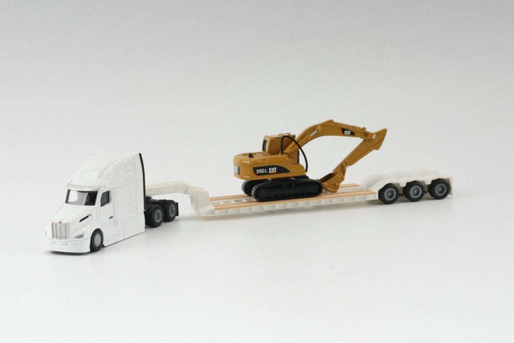 White Peterbilt 579 Tractor with Lowboy Trailer CAT 351C Excavator (HO Scale)