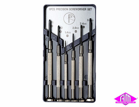 - The set contains the following: (4) four flat head screwdrivers measuring (1.4mm, 2.0mm, 2.4mm and 2.9mm). The set also includes two phillips (#0 and #1.2).