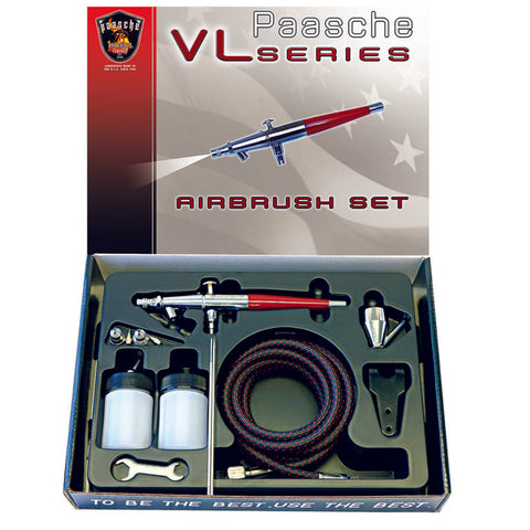VL airbrush with size 3 head, size 1 & 5 heads, 1 oz bottle assembly, 1/4oz metal cup, 1oz storage bottle, 6' braided hose, hanger, wrench and lessons book.